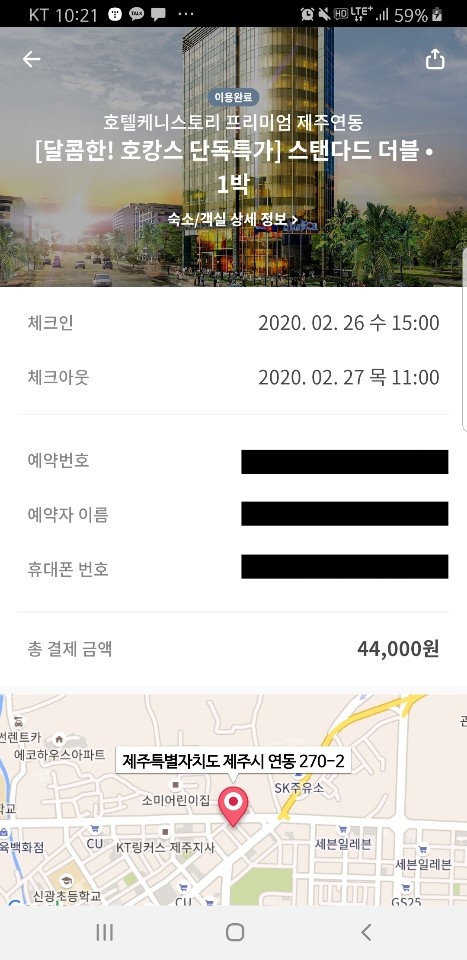 가격을 보세요. 44,000원에 제주시 비즈니스 호텔을 예약했습니다.