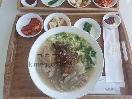 제주도의 고기 국수에 하갈비의 특별한 갈비가 올라가 있습니다.