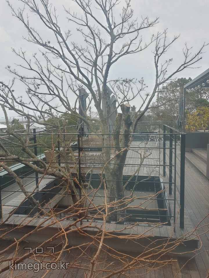 3층 테라스에는 나무가 바닥을 뚫고 나오는 정말 특이한 디자인이었어요.