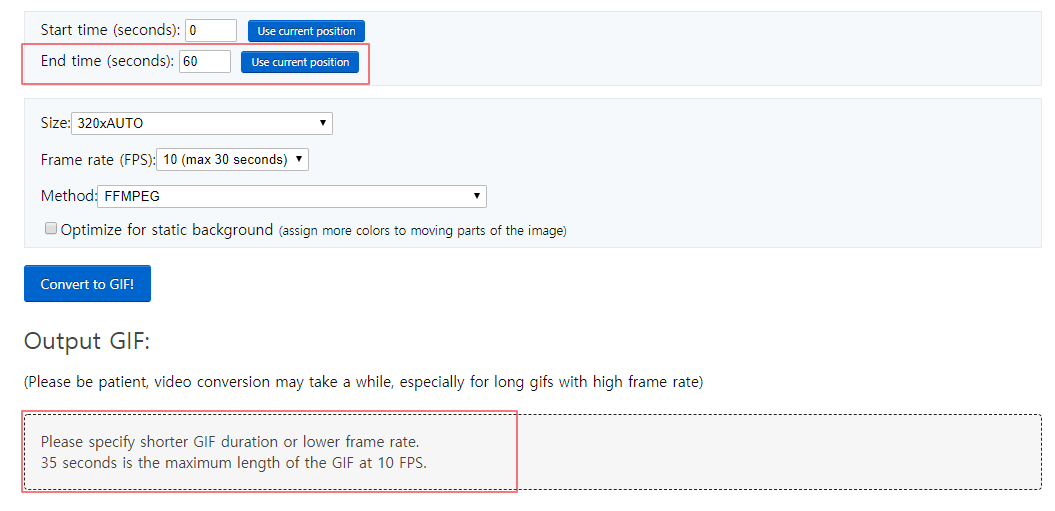 제가 60초로 했더니 35초 이하로 만들라고 메시지가 뜨네요.