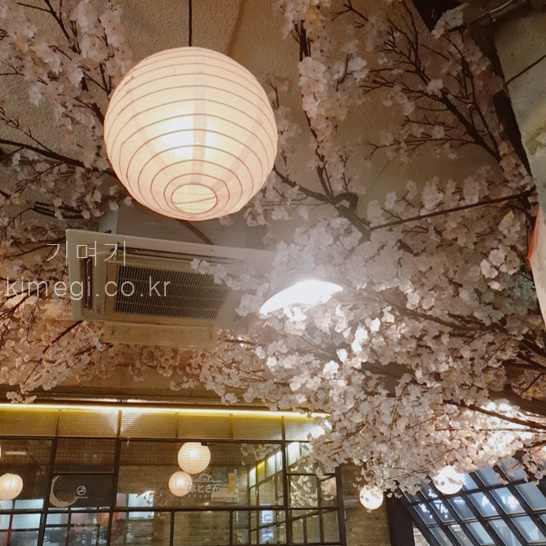 조명 등과 벚꽃나무로 호프가 이자카야 느낌으로 변했어요.