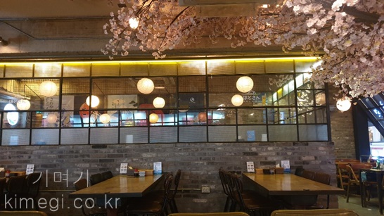 조명 등과 벚꽃나무로 호프가 이자카야 느낌으로 변했어요.