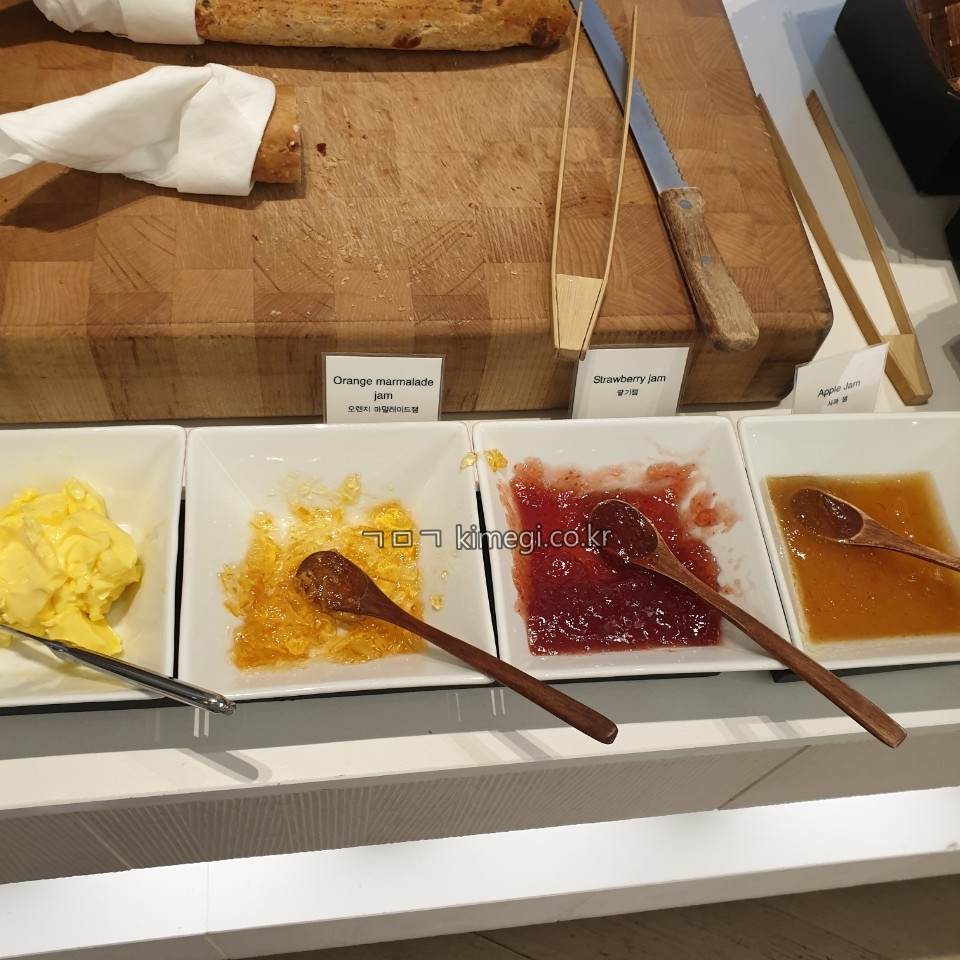 바게트 앞에 유자 잼, 딸기잼, 사과잼도 준비되어 있어요.
