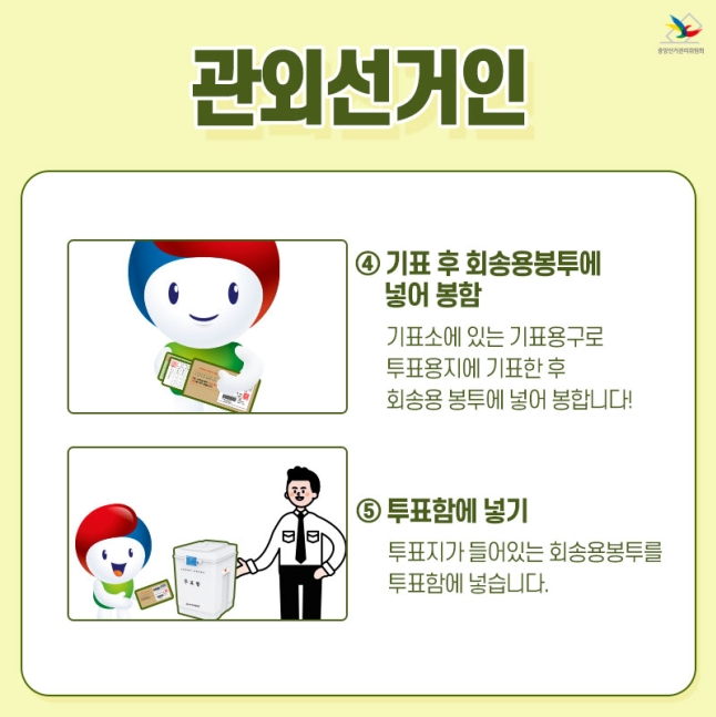 3) 투표용지(지역구 1장, 비례대표 1장)와 회송용 봉투 수령