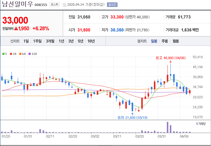 이낙연 테마주의 대장주 남선알루미늄입니다.