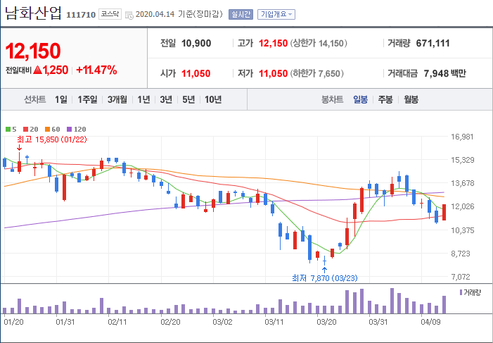 남화산업은 11% 상승으로 마무리했네요.