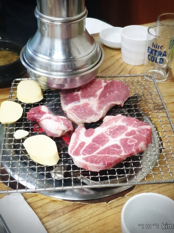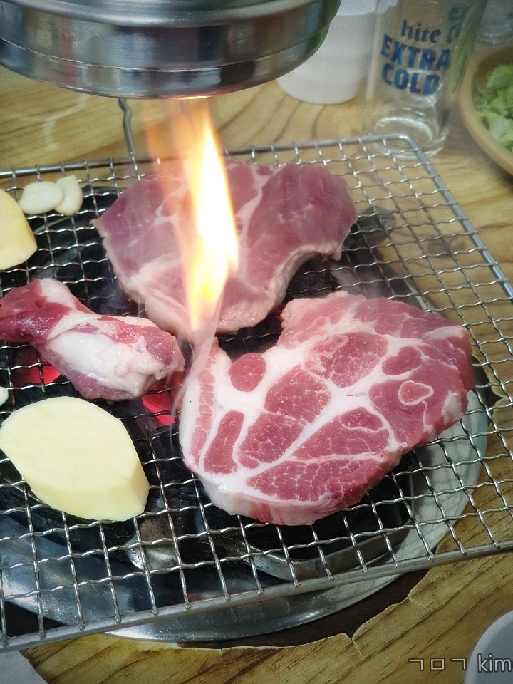 목 고깃집의 가장 장점은 숯불에 구워 먹는 거예요.
