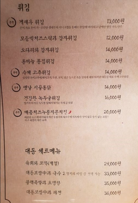 튀김, 탕, 구이등 메뉴가 많이 있습니다.