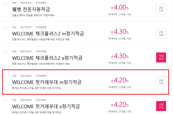 " WELCOME 첫 거래 우대 m정기적금 "은 가입이 쉽고 우대이율 조건이 자동이체밖에 없어 쉽게 4.2%의 혜택을 보실 수 있습니다.