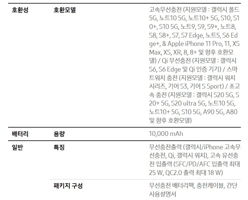 삼성전자 무선 보조 배터리는 WPC Qi 무선 충전 기능이 적용된 삼성 또는 타사 스마트폰 그리고 갤럭시 버즈, 버즈+, 갤럭시 워치 액티브 2, 갤럭시 워치 액티브, 갤럭시 워치와 같은 웨어러블 제품에도 사용 가능합니다.