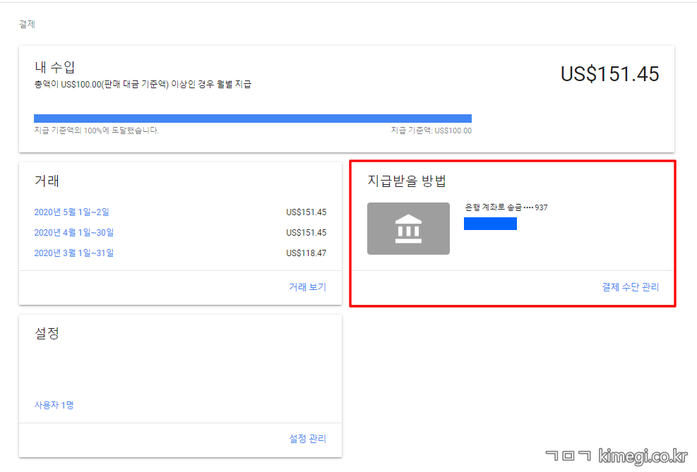 PIN 번호 등록 후 구글 애드센스에 SC 제일은행 계좌를 등록 완료했습니다.