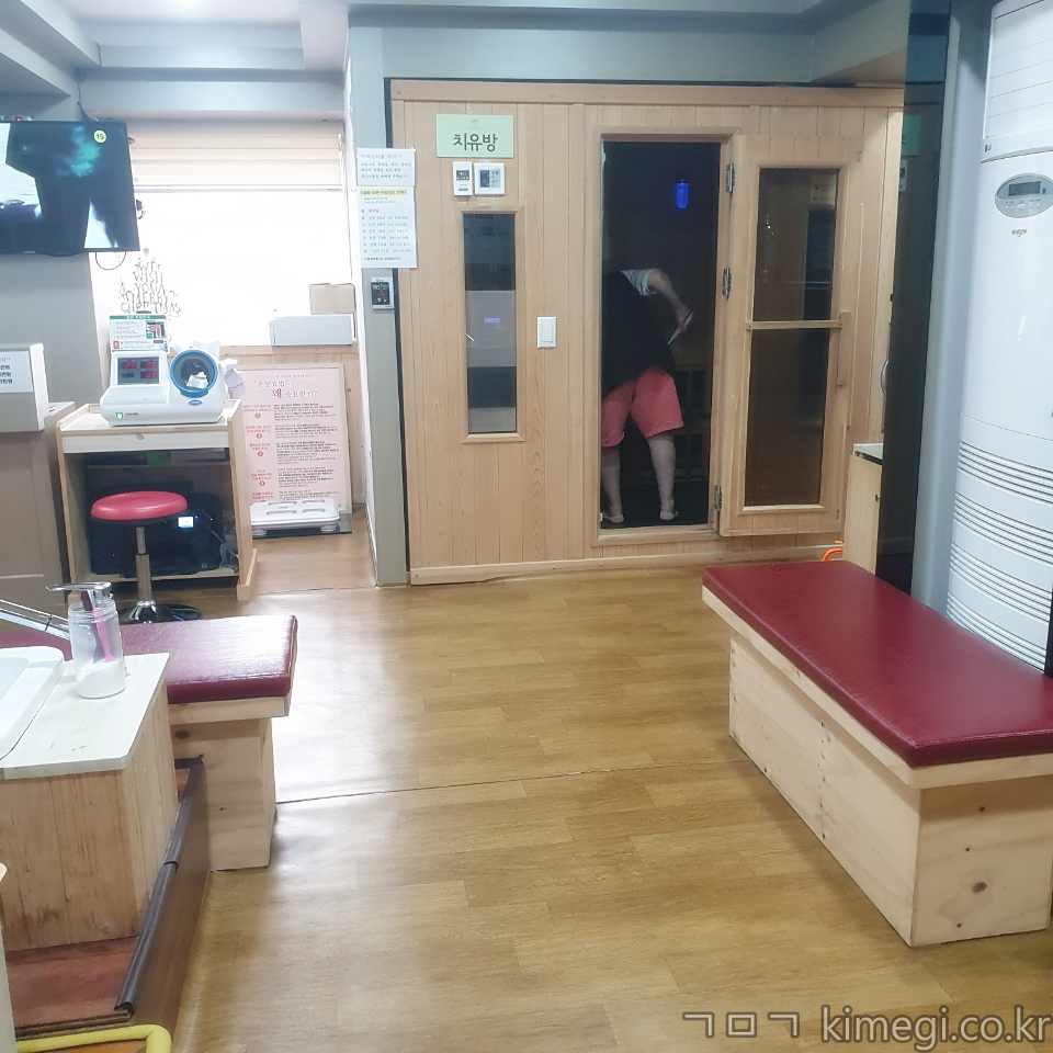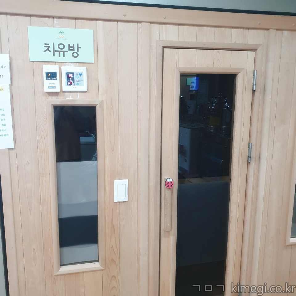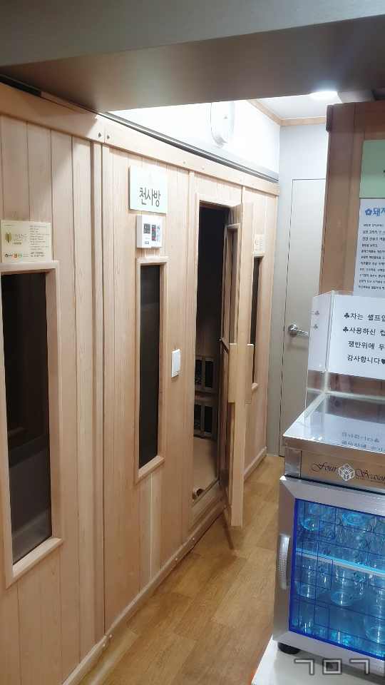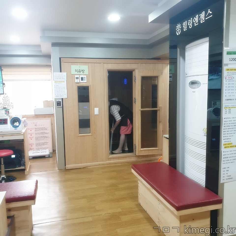 나무는 편백나무이며 벽에 있는 기계에서 원적외선을 내뿜어 속부터 뜨겁게 해서 땀으로 노폐물을 배출해 준다고 합니다. 기대고 있으면 1분당 2천 번 진동 풀어주는 효과도 있대요.