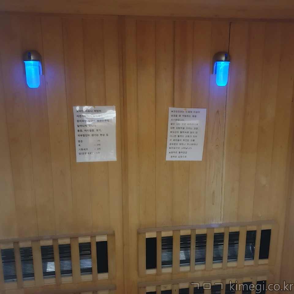나무는 편백나무이며 벽에 있는 기계에서 원적외선을 내뿜어 속부터 뜨겁게 해서 땀으로 노폐물을 배출해 준다고 합니다. 기대고 있으면 1분당 2천 번 진동 풀어주는 효과도 있대요.