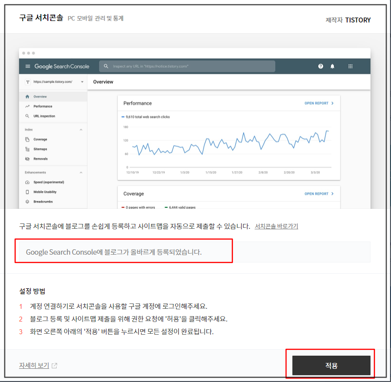 구글 서치 콘솔에 블로그가 올바르게 등록되었다는 문구가 생성됩니다.