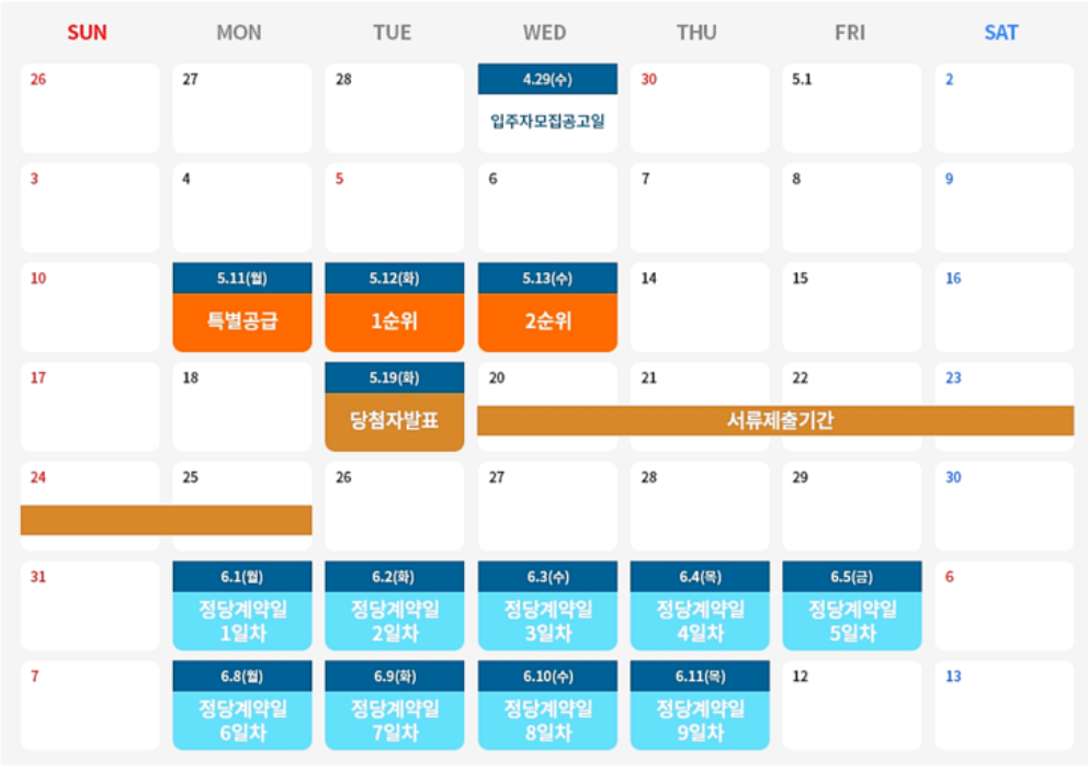 이후 5월 25일까지 서류 제출기간을 거쳐 6월 1일부터 6월 11일 까지 계약 진행하면 됩니다.