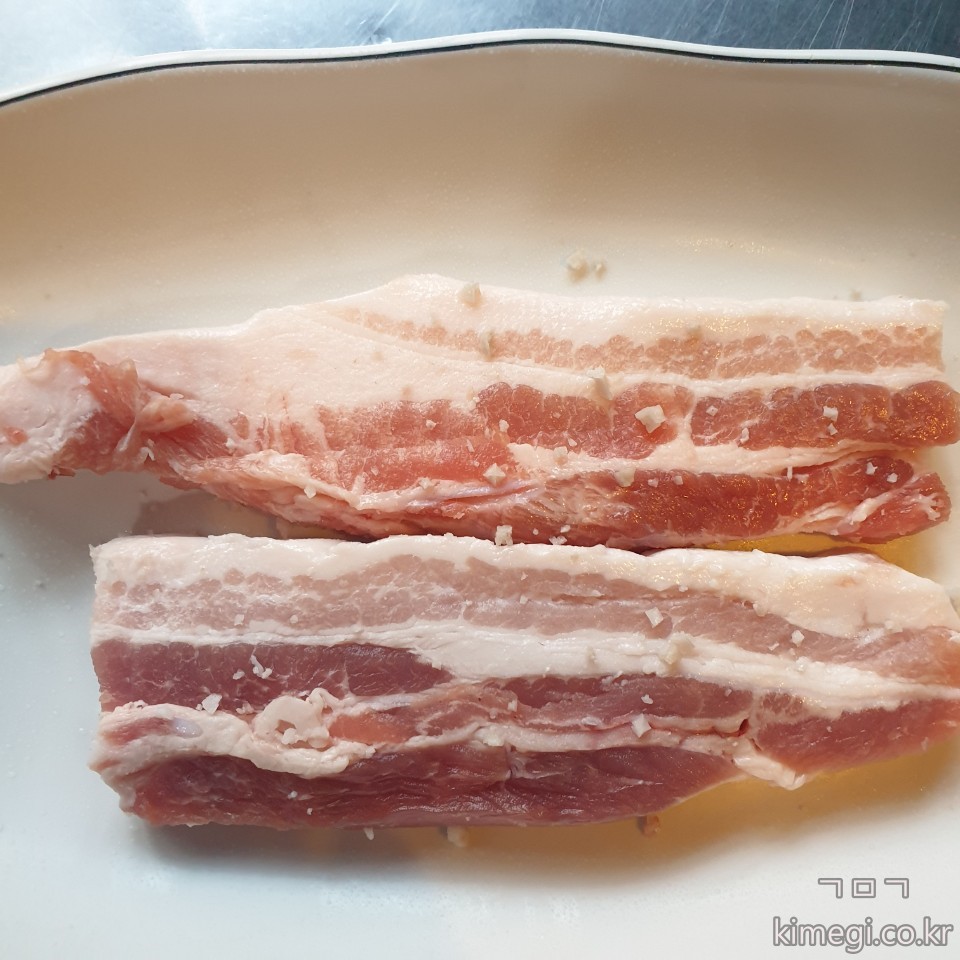 삼겹살은 김치와 마늘은 같이 구워 술안주 삼아 먹습니다.