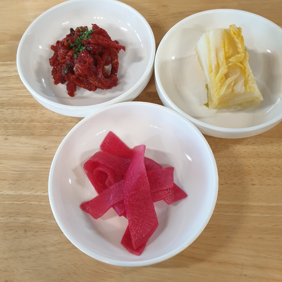 밑반찬에는 고명에 올라가는 명태 회무침과 김치, 무생채가 나왔습니다.
