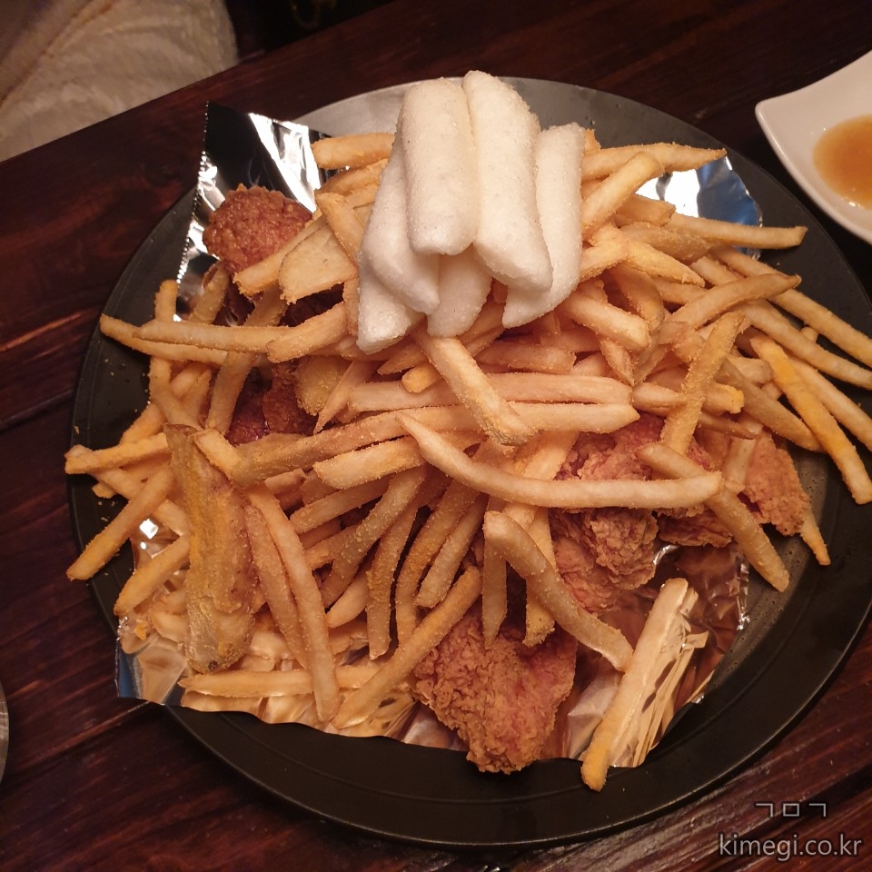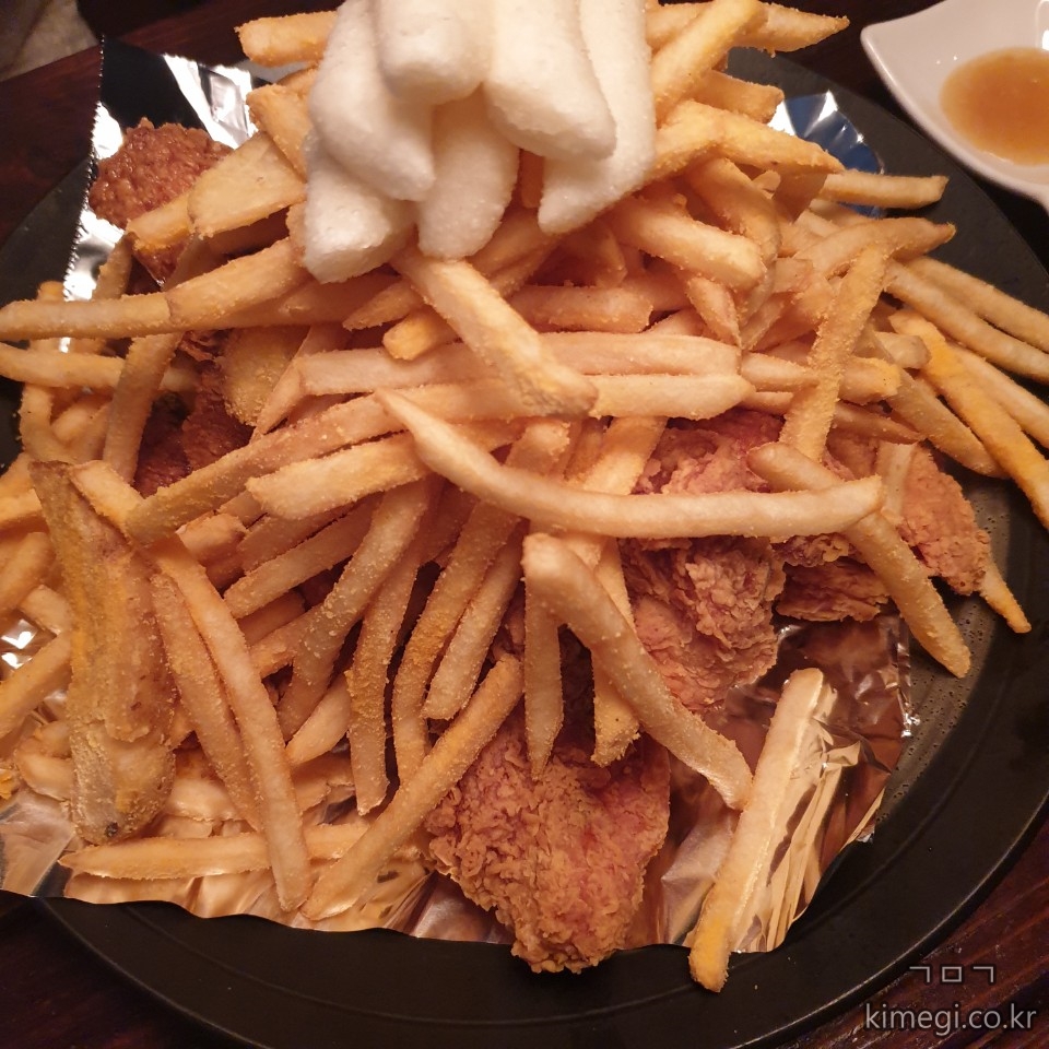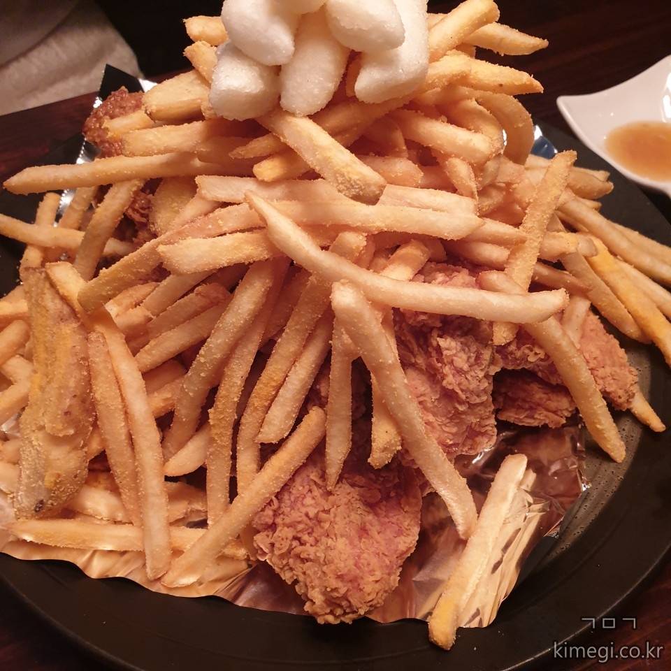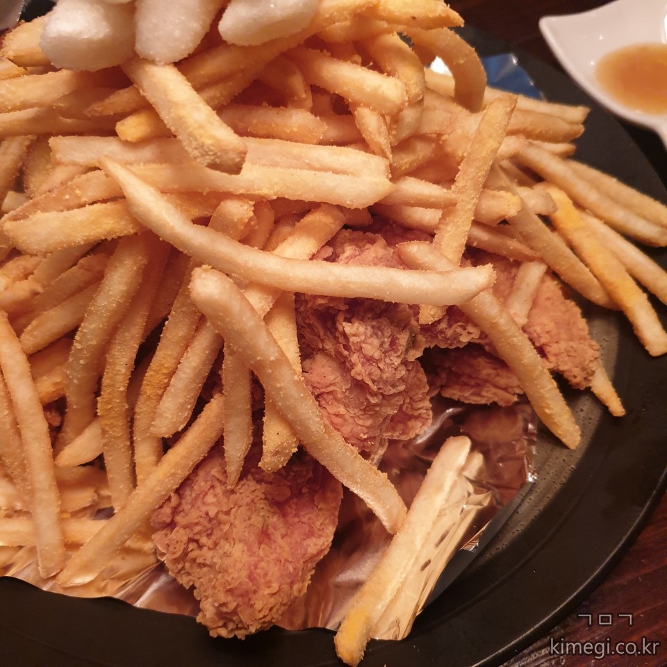 치킨은 위에 감자튀김과 떡튀김이 올라가 정말 푸짐한 양이 나옵니다.
