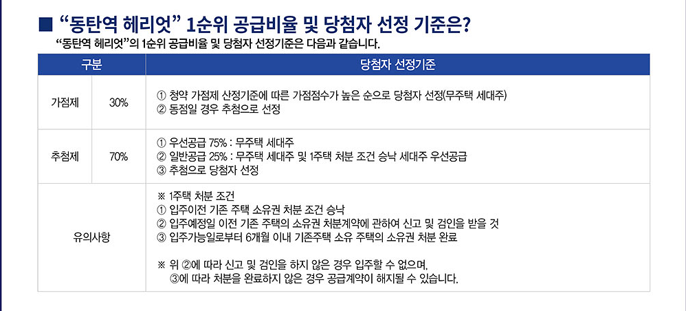 동탄역 헤리엇은 가점제 30%, 추첨제 70% 비율로 당첨자를 선정합니다.