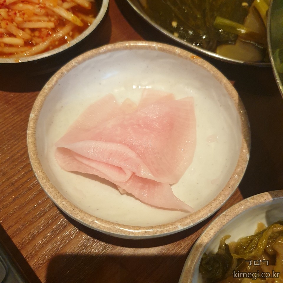 무생채, 무쌈, 깻잎 장아찌입니다.