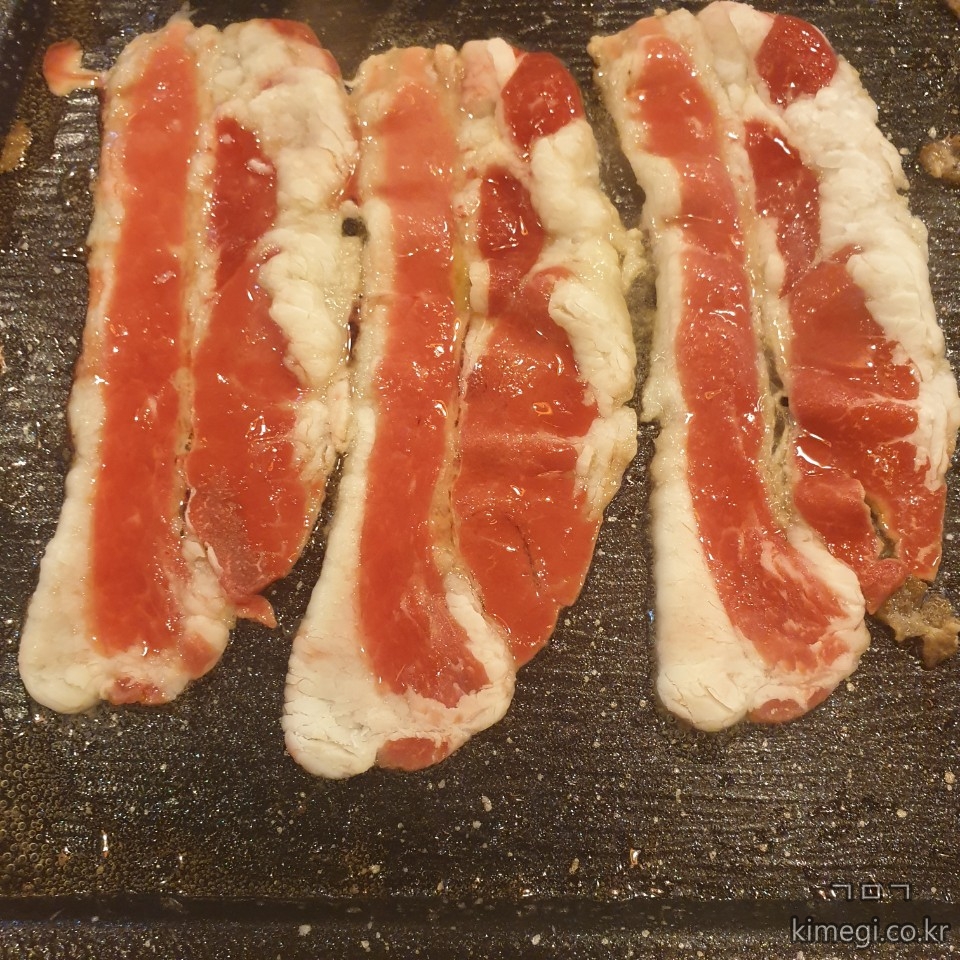 냉동 삼겹살도 얇고 길게 잘라서 구운 다음 밥을 싸 먹으면 참 맛있습니다.