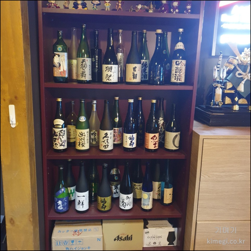 양재역 이자카야 식감이야기 입구에 들어서면 사케 병이 진열되어 있어요.