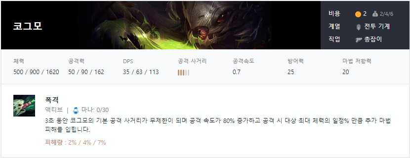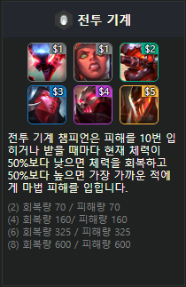 시너지 : 전투기계 챔피언은 피해를 10번 입히거나 받을 떄마다 현재 체력이 50%낮으면 체력을 회박하고 50%보다 높으면 가장 가꾸운 적에게 마법피해를 입힙니다.