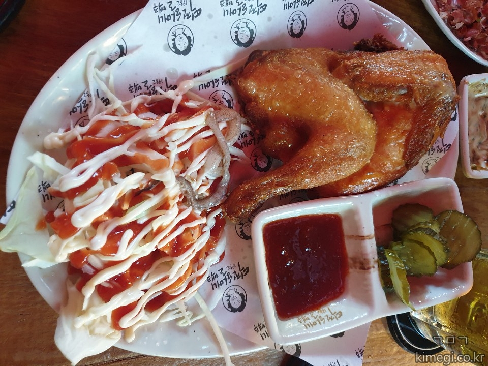 저렴한 안주 가격을 고수하는 할맥에서는 반마리의 통닭도 판매합니다.