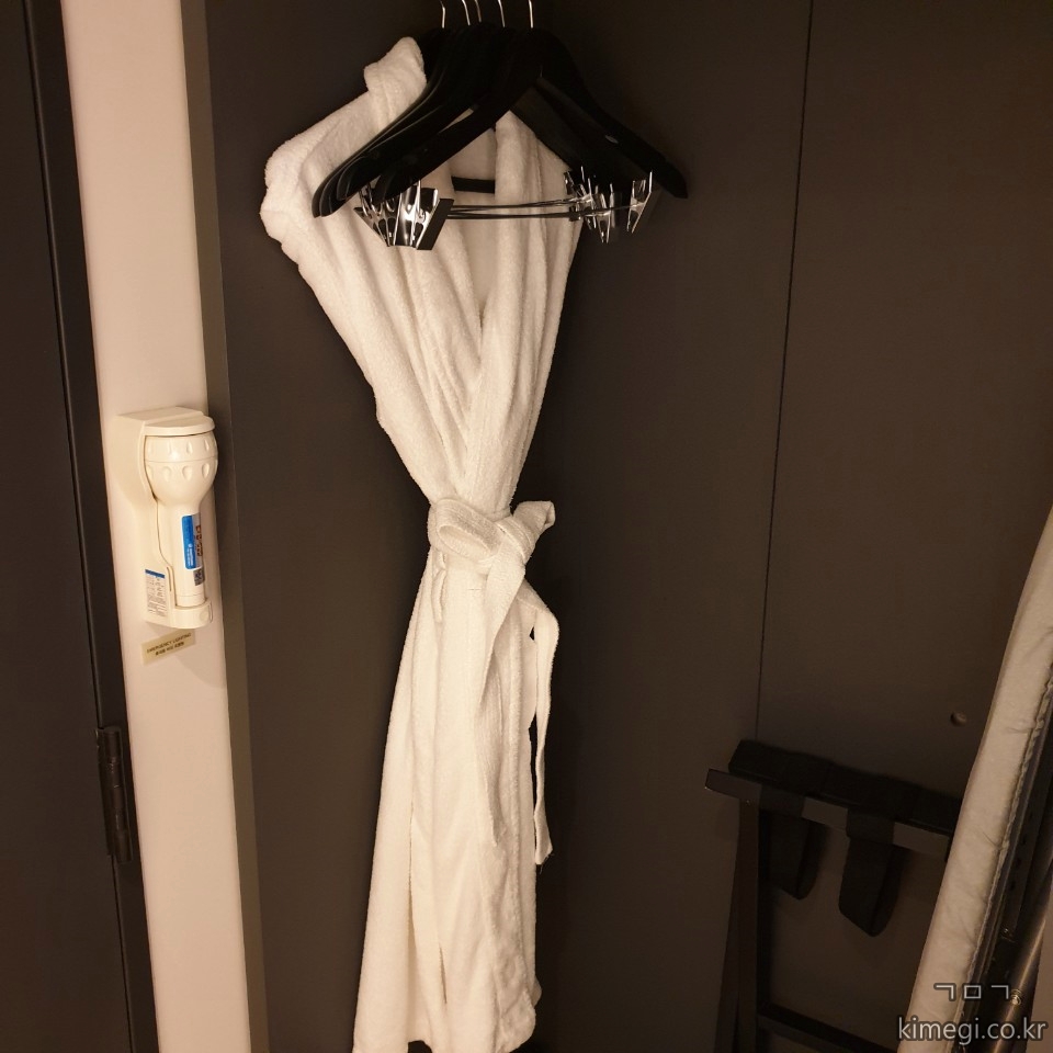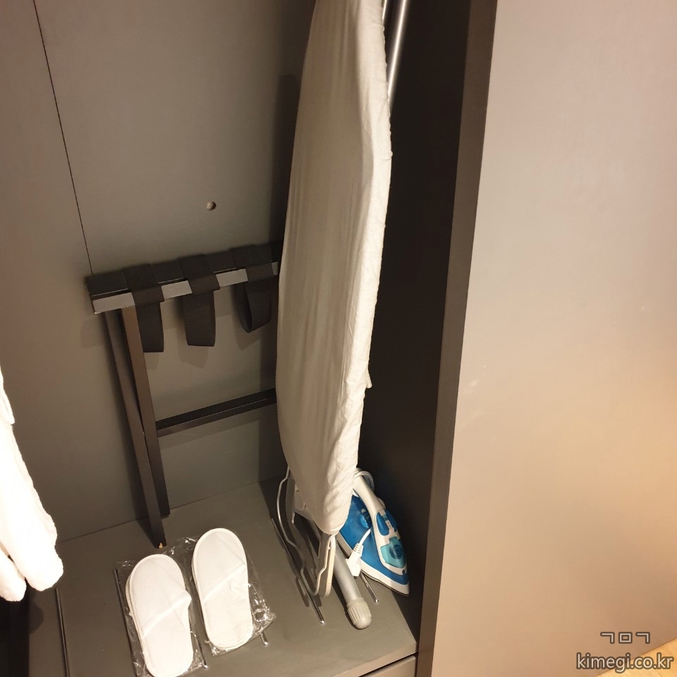 옷장에는 가운과 다리미, 받침대, 슬리퍼가 있어요.