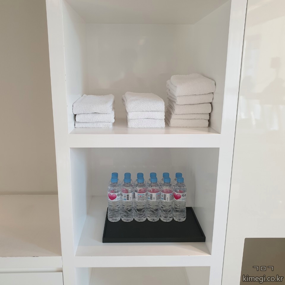입구에 물과 수건을 자유롭게 이용할 수 있어요.