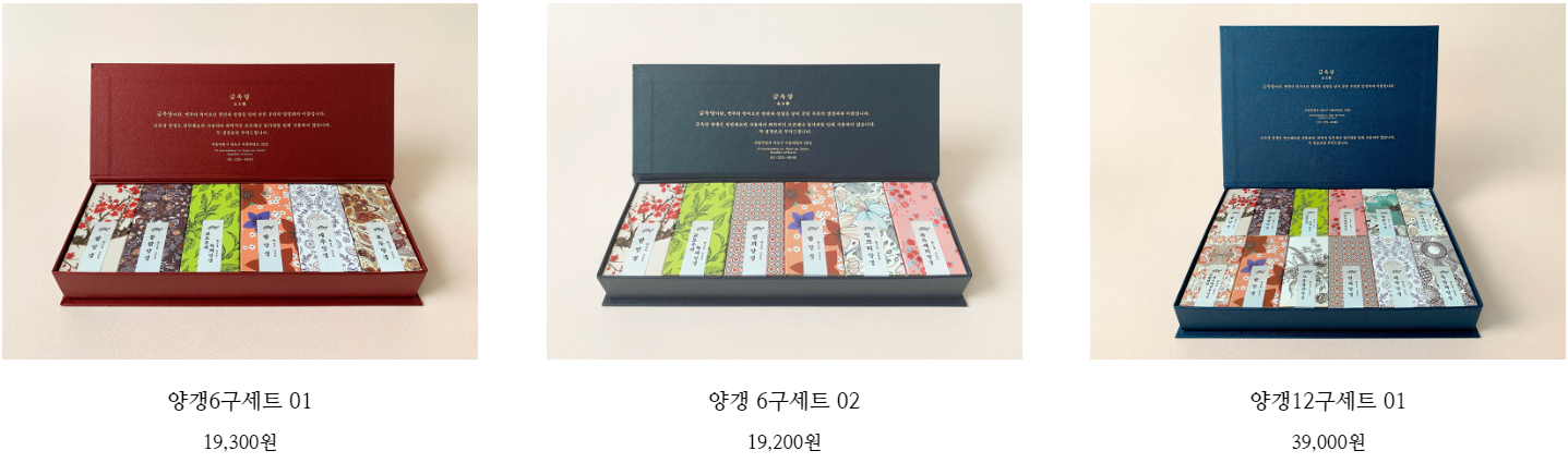 전통적인 문향과 색이 양갱의 내용물을 떠올리게 하는 색으로 그려져 고급스럽습니다.