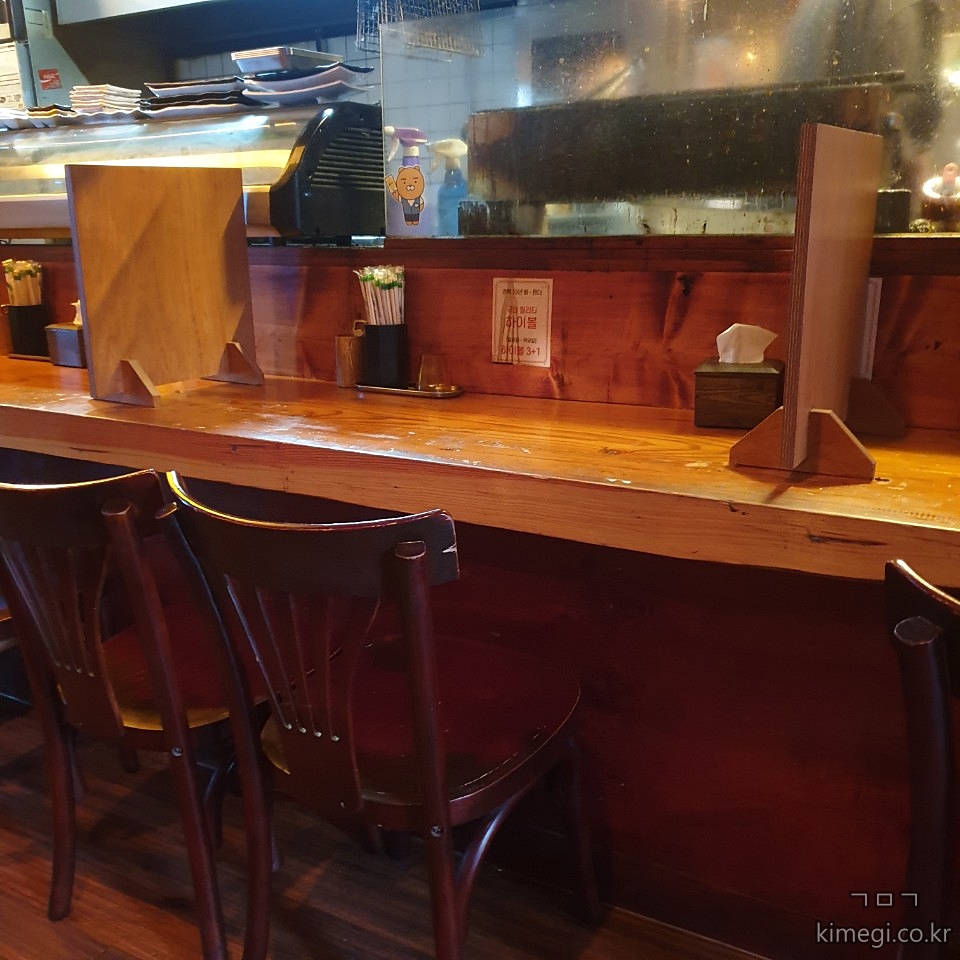바 형식인 자리에 칸막이를 두어 혼술 하기 좋게 만들어 놓았어요.