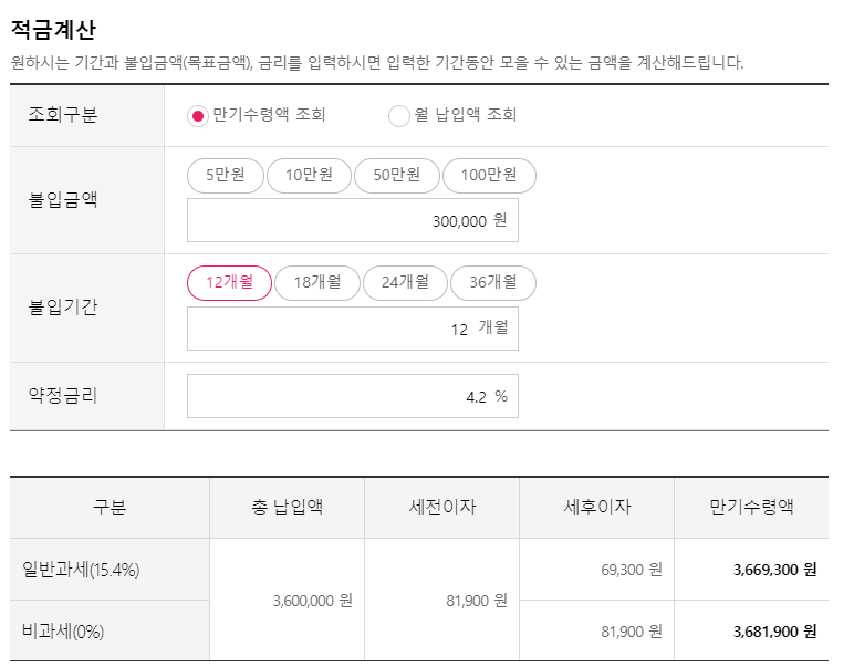 월 30만 원씩 1년 적금 가입 시 세전 81,900원의 이자 수익을 얻을 수 있습니다.