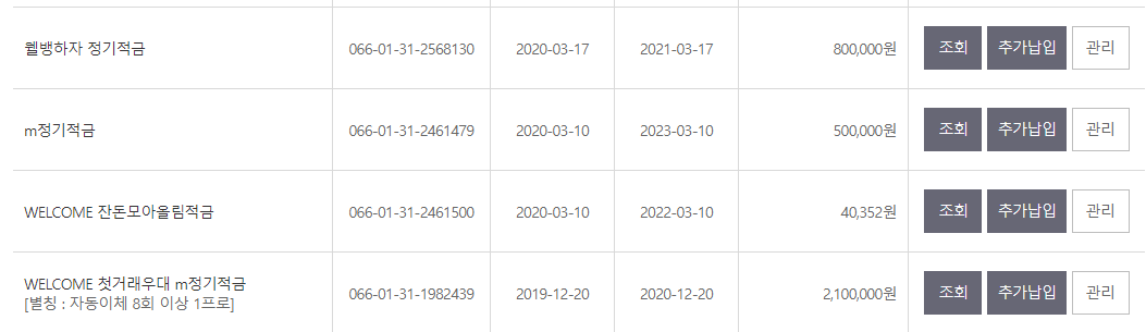 저는 첫 거래 저축뿐만 아니라 '웰뱅하자 정기적금'과 'm정기적금'을 가입하고 있습니다.