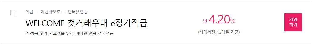 웰컴 저축은행 [4.2% WELCOME 첫 거래 우대 e정기적금]을 추천드립니다.