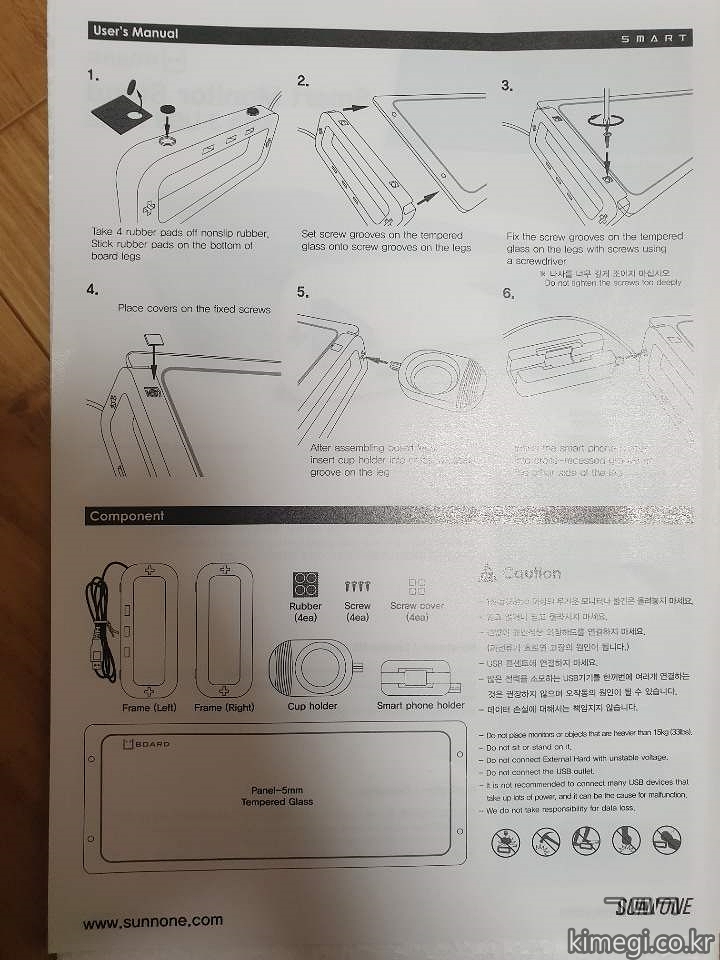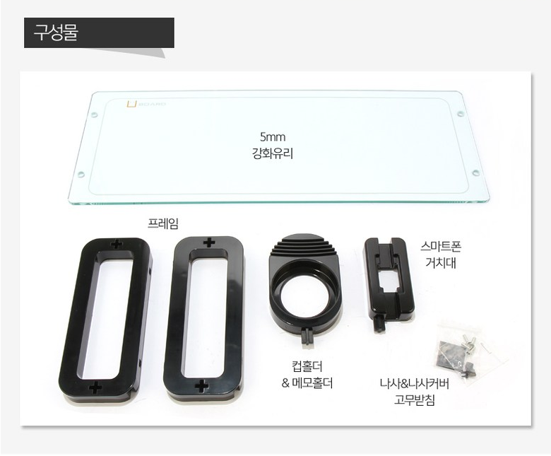 5mm 강화유리, 프레임, 컵홀더, 스마트폰 거치대, 나사 등이 담겨있습니다.