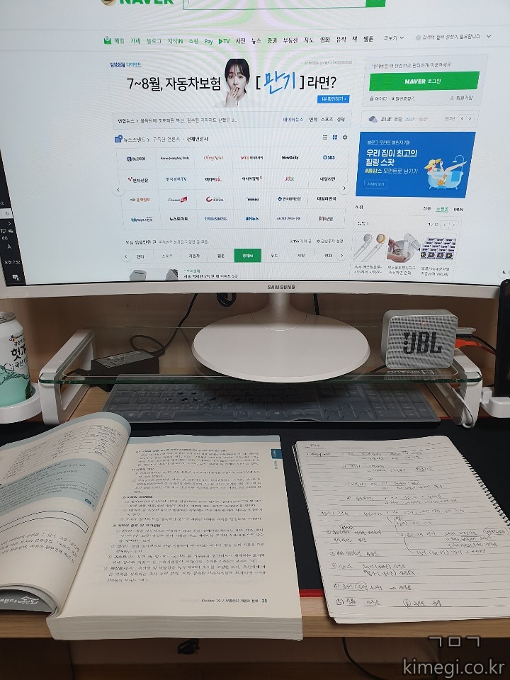 인강을 들을 때는 키보드를 받침대 밑으로 넣어서 책상을 충분히 활용 가능해요.