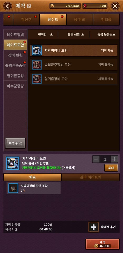 이렇게 레이드 도안 조각으로 레이드 지박귀 장비 도안을 만드셔도 됩니다.