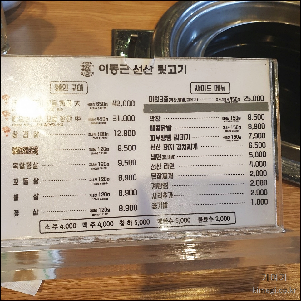 이동근 선산 뒷고기 메뉴판입니다.