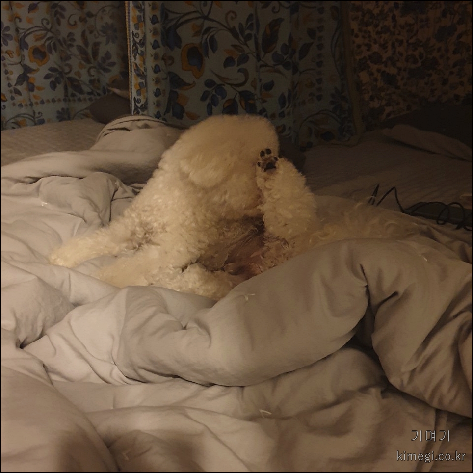 먹을 것을 달라고 조르면서 생떼 부리다가 나중에는 제 침대에 가서 누워있더라고요.