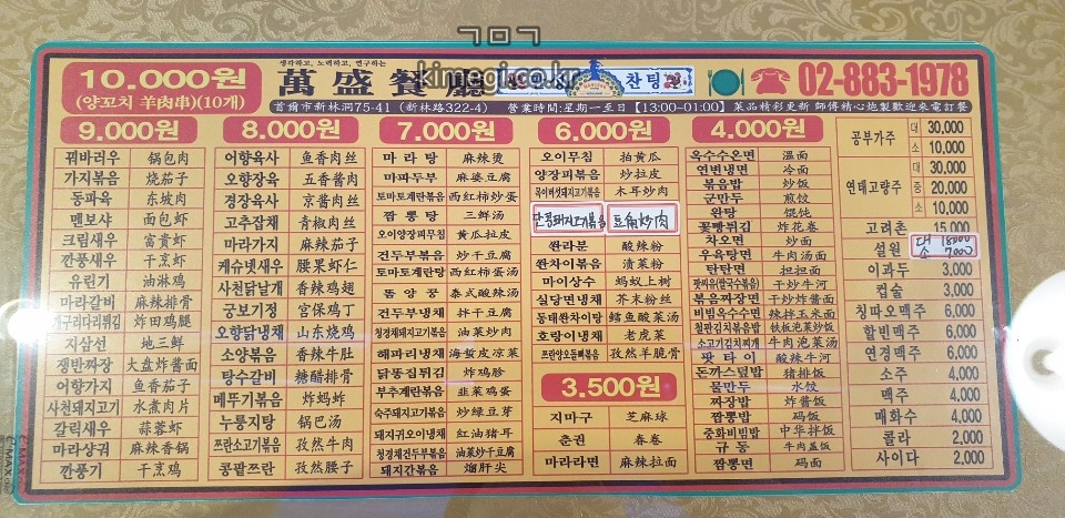 메뉴판을 보면 만성찬팅에서 가장 비싼 메뉴가 양꼬치입니다.
