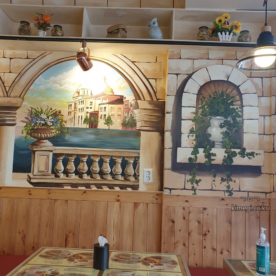 벽에 그림이 너무 멋있게 그려져 있습니다.
