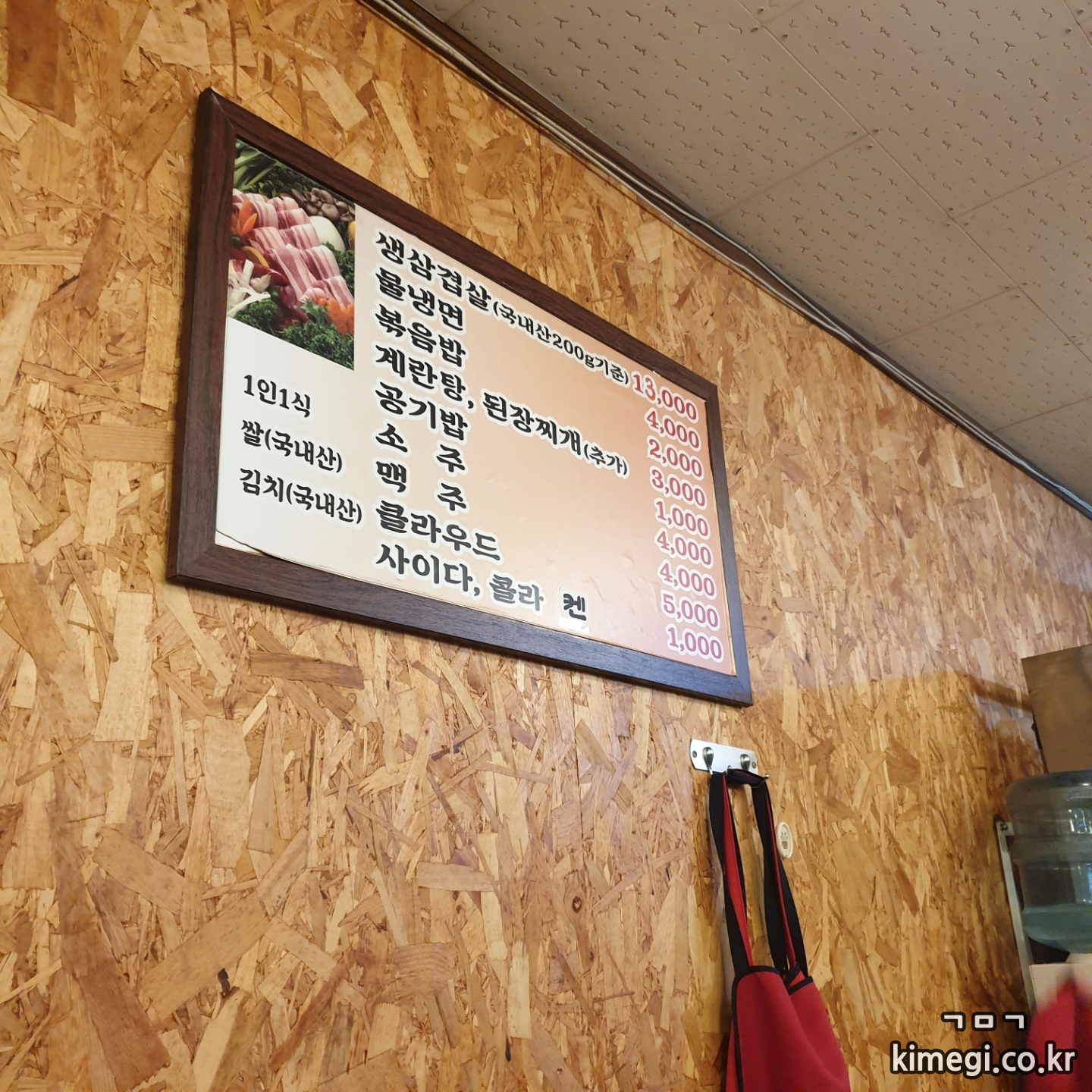 음암역 삼겹살집 '시골김치 삼겹살'의 메뉴판입니다.
