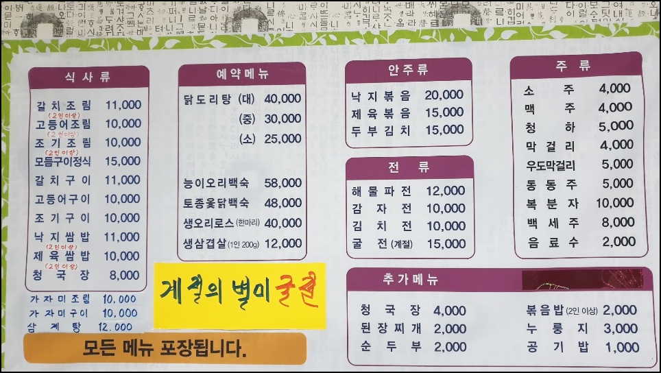 갈치조림, 고등어 구이등 식사 메뉴가 있고 백숙 종류가 있습니다.