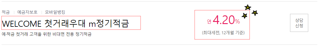 'WELCOME 첫 거래 우대 m정기적금' 은 우대금리 조건도 간단하고