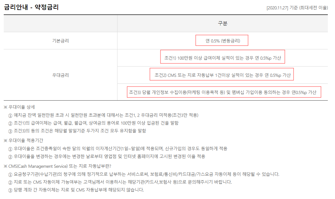 1) 100만 원 이상 매월 급여 이체하면 0.5%