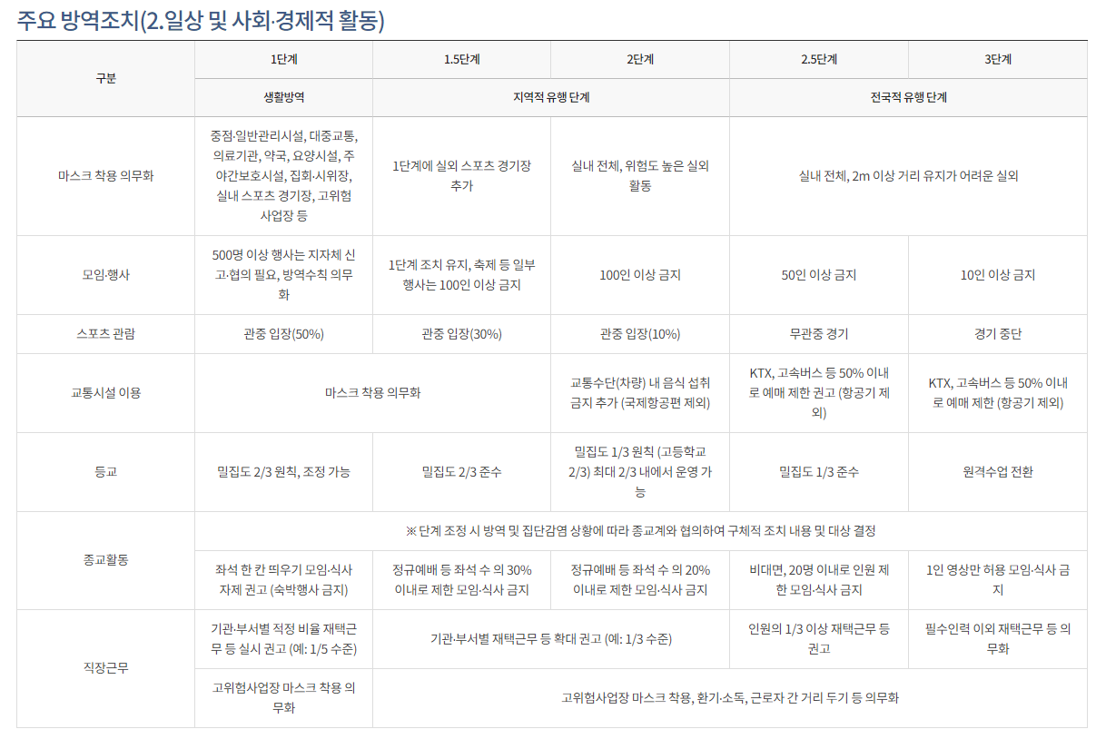 일상 및 사회, 결제적 활동 단계별 방역조치입니다.