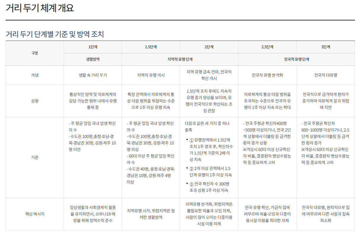코로나19 거리두기 단계별 방역조치 가이드 입니다.
