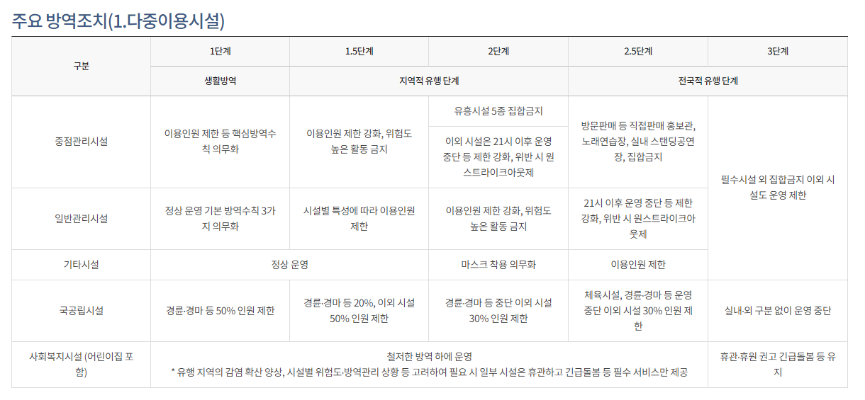 다중이용시설에 대한 단계별 방역조치입니다.