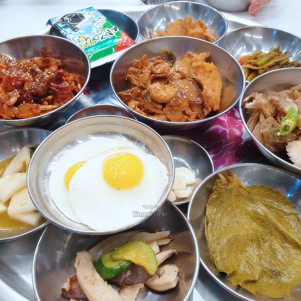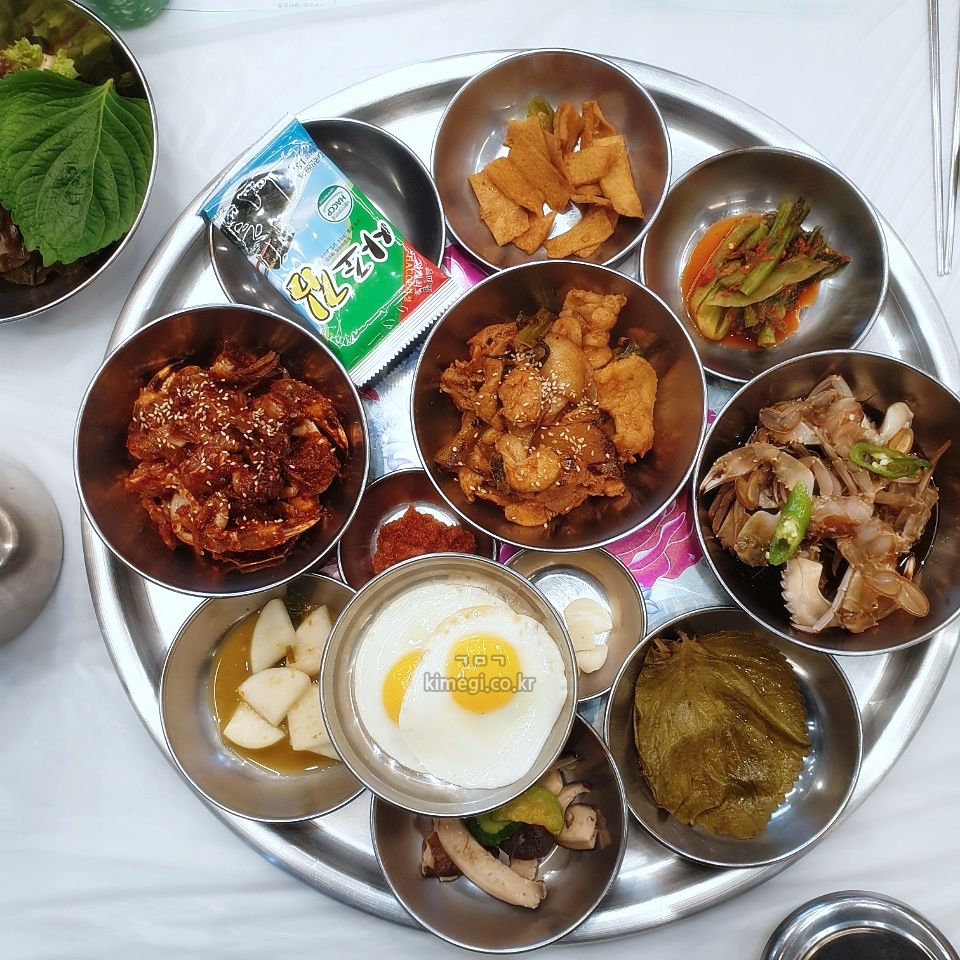 계란 프라이, 버섯볶음, 무김치, 상추 깻잎, 마늘, 꽃게탕까지